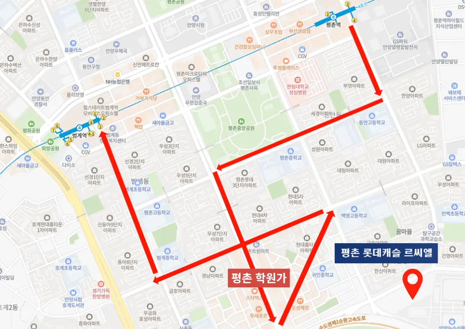 등 명문 라인과 평촌 학원가가 인접합니다. 도보/셔틀 통학, 야간 보행 안전, CCTV·가로등 등 교육생활 전반이 강점입니다.
